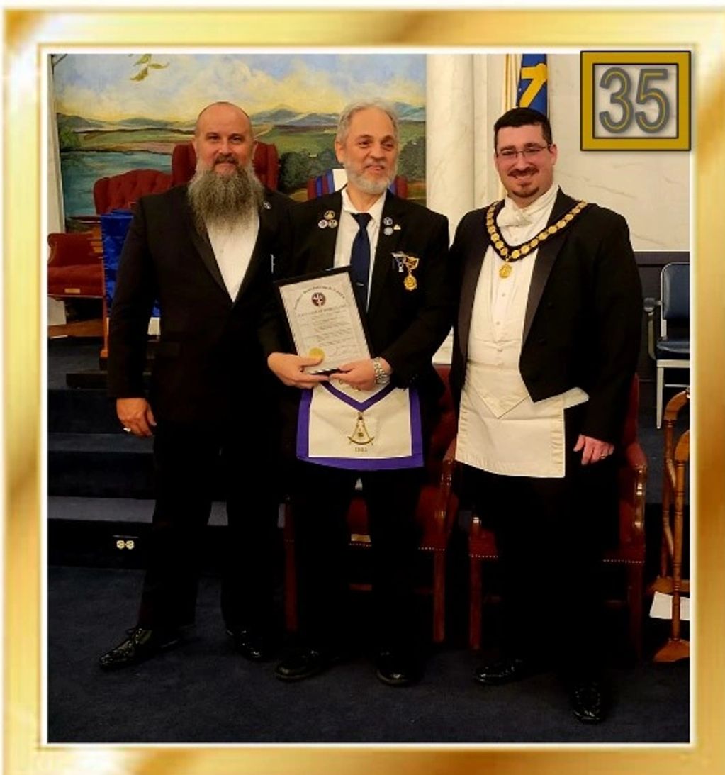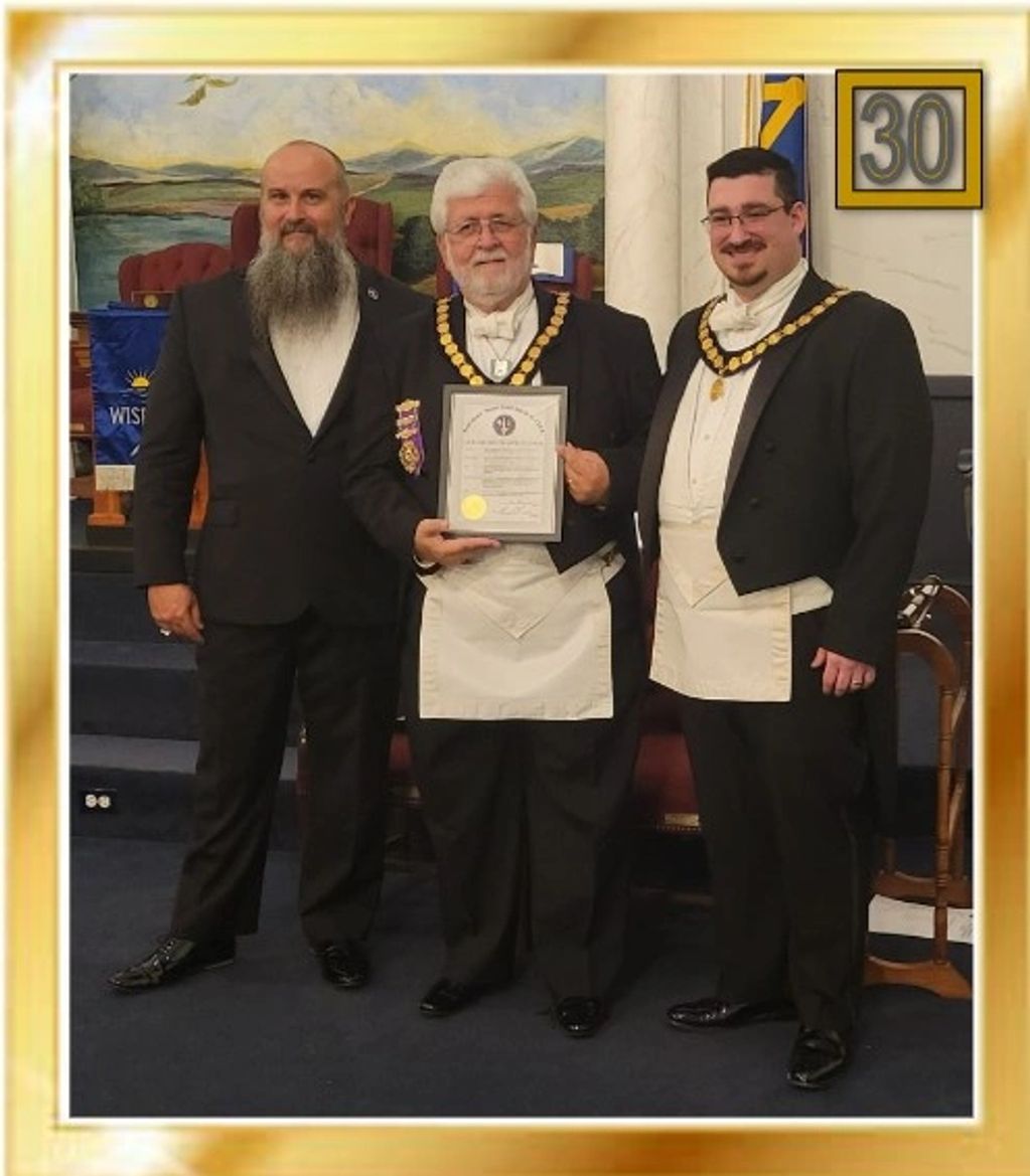 Most Worshipful Brother Alan Gordon receives the 30 year service award from Worshipful Brother Aaron Kamerer and Most Worshipful Brother Jacob M. Bressman