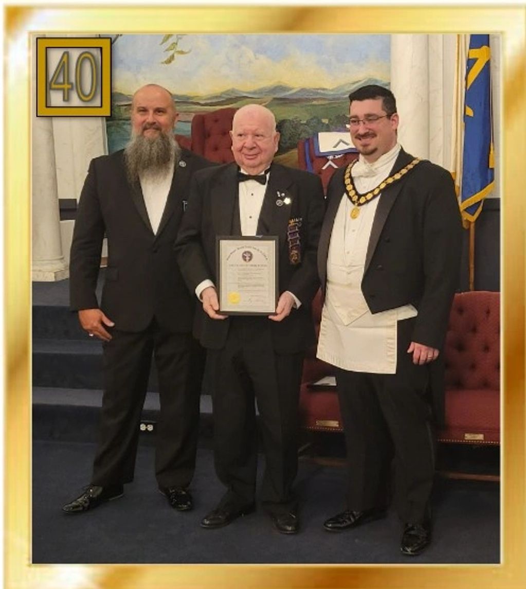 Worshipful Brother Aaron Kamerer and Most Worshipful Brother Jacob M. Bressman present Most Worshipful Brother Robert Starr with his 40th year of service certificate.
