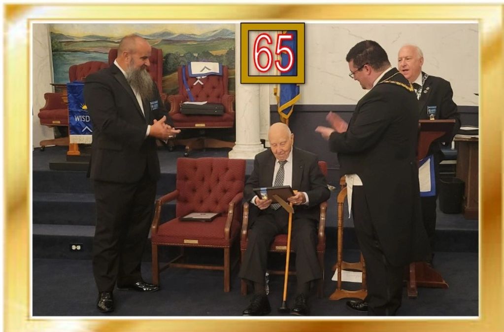 Worshipful Brother Aaron Kamerer and Most Worshipful Brother Jacob M. Bressman presents the 65 year award to Right Worhipful Brother Harold Grainger.