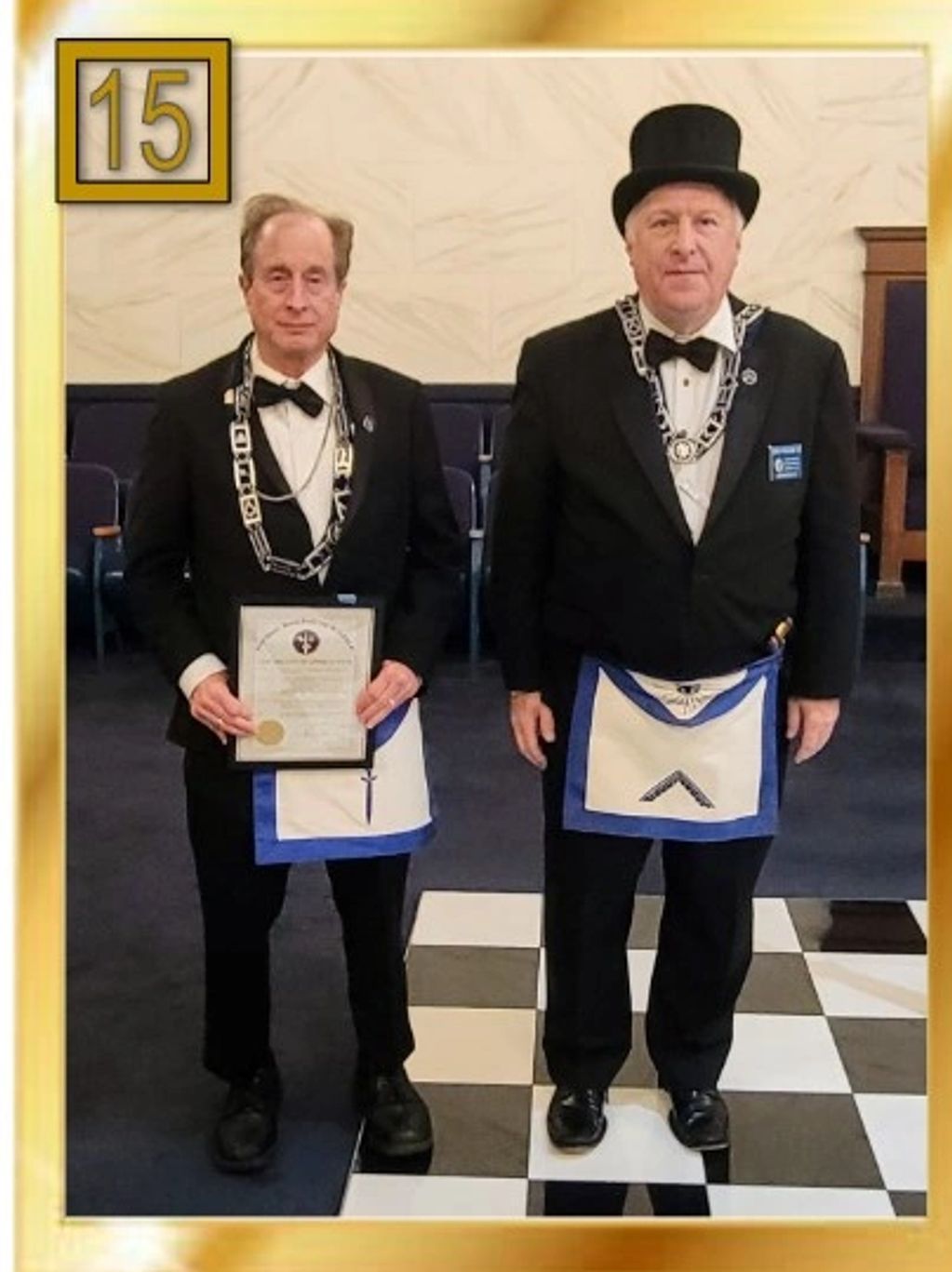 Brother Harold Henig received his award for 15 years of service to the Craft from Worshipful Brother Jerry Keilsohn.