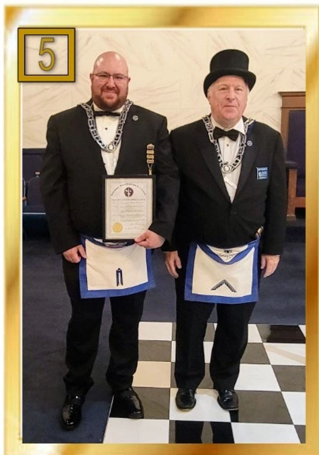 Most Worshipful Brother Jacob M. Bressman presented our Worshipful Master Aaron Kamerer with his 5-Year service certificate.