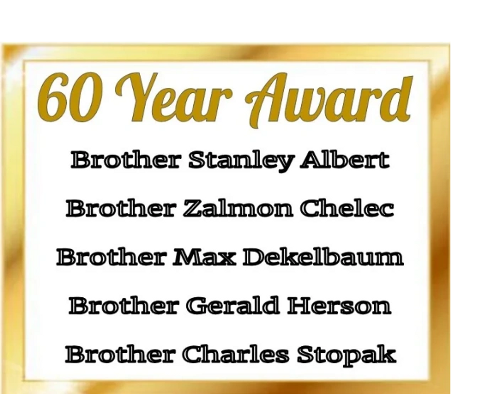 Brothers Stanley Albert, Zalmon Chelec, Max Dekelbaum,Gerald Herson, Charles Stopak were uable to attend and will receive their 60 Year Service Certificates.